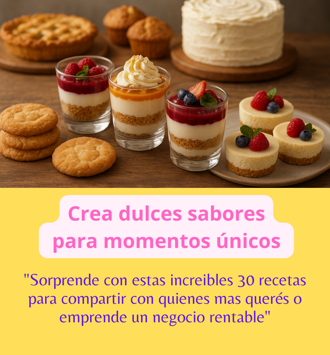 Descubrí el e-book de 30 Recetas Dulces, creado para quienes aman el mundo de la repostería y desean sorprender con postres que combinan sabor, estética y practicidad. Este recetario reúne una selección exclusiva de postres en vaso, mini tortas y bocados dulces, pensados para lucirse en eventos, reuniones familiares, mesas dulces o incluso como una oportunidad real de emprender y generar ingresos ofreciendo productos irresistibles.